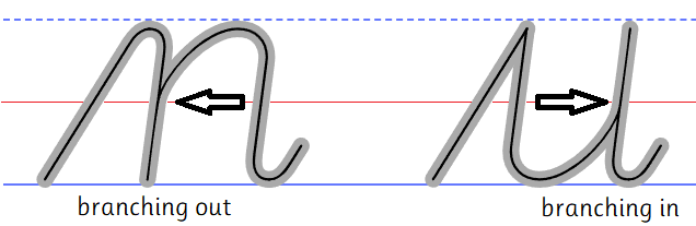 Counters have a 'branching in' point (a, d, g, and q) or a 'branching out' point (p) just like arches do. These points are located halfway between the baseline and the waist line, just like with the arches.