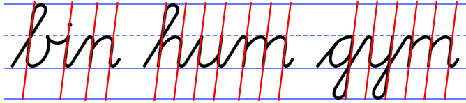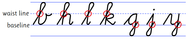 The letters b, h, l, and k have a tall loop. The letters g, j, and y have a low loop. Tall loops intersect themselves exactly on the waist line (sometimes call 'midline'). Low loops