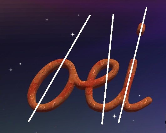 In Cogncur, the letters c and e are based on the same ellipse as the letter o. This ellipse has the same height/width ratio - 1.618 - as the arches discussed earlier. A line can be drawn through the highest and lowest point of an ellipse to visualize its slant. Cogncur takes care to ensure that ellipses are parallel to each other and to other letters.